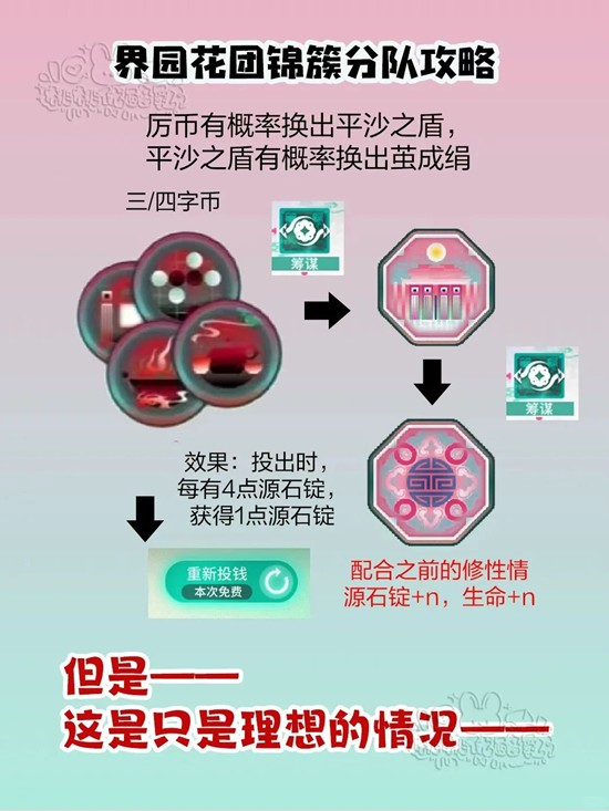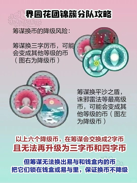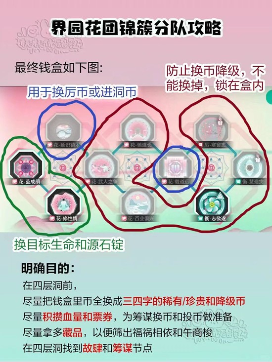 总结:尽可能在前期积累血量和票券,将钱盒里的币全部换为三字/四字的珍稀/贵重通宝,就可以进筹谋开始换修性情和茧成绢,换的时候出现p4的降级币就留存换一个别的币换,可以通过反复换树洞币达到反复进洞-筹谋-故肆回血-筹谋-直到换出需要的币