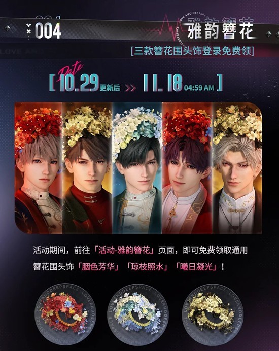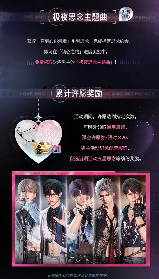 参与活动,体验专属剧情,免费获取「深空许愿券·限时*10」、「钻石*500」、通用饰品、双人拍照动作等缤纷奖励,还可解锁他的特别短信及朋友圈!