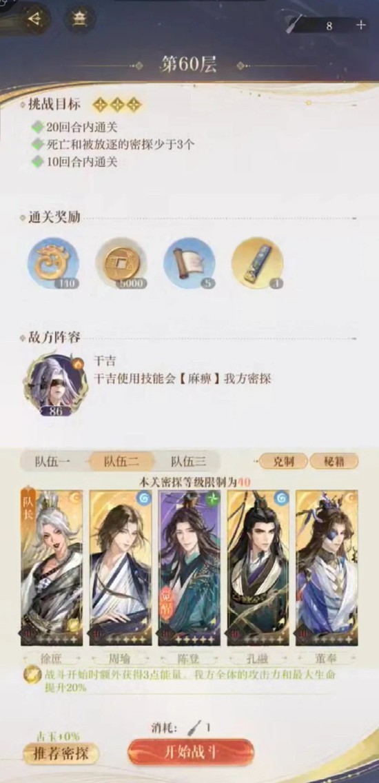 以上就是如鸢左慈地宫60干吉三星低练配队无邈无惇无豹攻略的全部内容了,更多游戏资讯,攻略内容敬请关注切游网,您的支持是我们努力的动力!