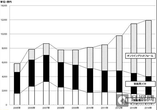 2014年日本家用机游戏市场规模,硬件、软件(包含在线内容)合计4039亿日元。而另一方面,在线平台(智能手机、功能手机、PC)市场,相比前年增长13%,达到7886亿日元。日本游戏市场规模达到史上最高的1兆1925亿日元。