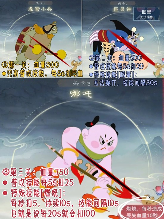 ③哪吒:血量750,普攻技能每5s扣25,特殊技能[燃烧]:每秒扣5,持续10s,技能间隔10s,也就是说每20s就会扣100