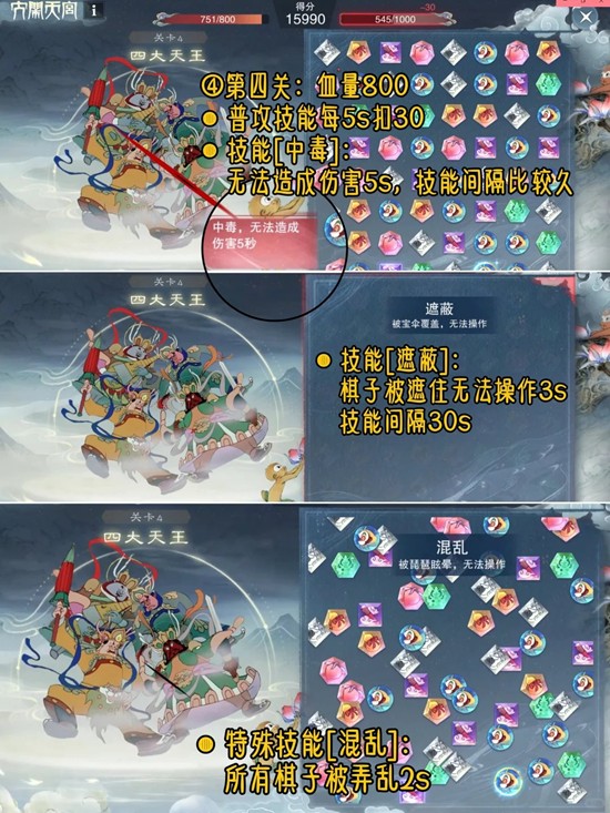 ④四大天王:血量800,普攻技能每5s扣30,特殊技能[混乱]:所有棋子被弄乱2s,技能[中毒]:无法造成伤害5s,技能间隔比较久,技能[遮蔽]:棋子被遮住无法操作3s,技能间隔30s