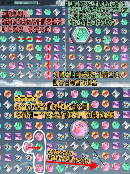 ①消除规则:横着或竖着≥3个同类棋子可以消除,斜着不行,如果过5s左右没找到要消的,会有系统提示棋在那放大跳动,不过它只提示三连的,有时候并不是最优选择。如果场上刚好没有任何三连,则会自动重置棋盘