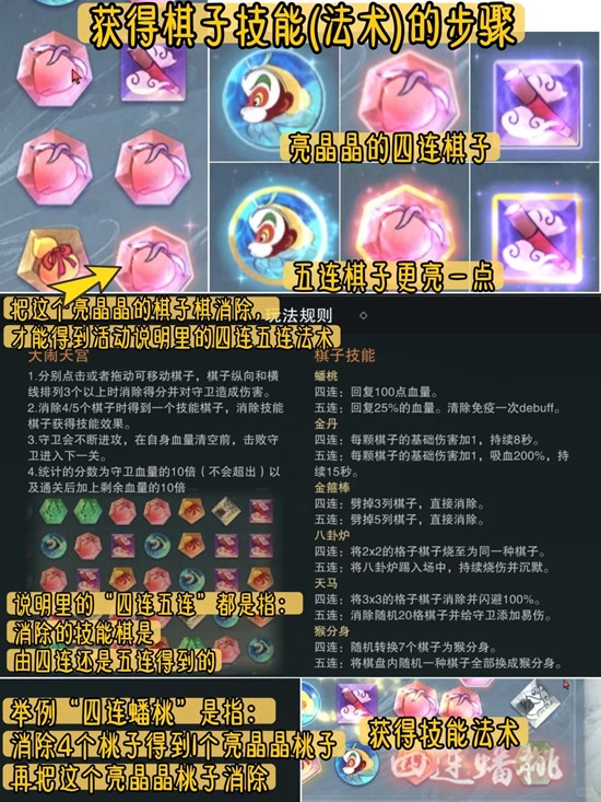 ⑤说明里的“四连五连”都是指:消除的技能棋是由四连还是五连得到的。举例“四连蟠桃”是指:消除4个桃子得到1个亮晶晶桃子,再把这个亮晶晶桃子消除