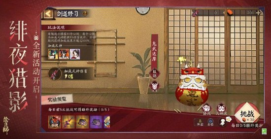 10月29日维护后至11月11日23:59结束,玩家可以通过点击庭院左侧地藏像、庭院挂墙小纸人或庭院内妖刀姬·绯夜猎刃进入活动界面,15级以上玩家都可参与。