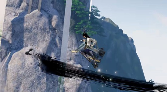 当玩家们踏入万象门派的领地,沿着画中路径继续深入探索时,眼前的景象令人震撼。巍峨的山峦如同泼墨般肆意挥洒,下方的亭台楼阁、黑瓦飞檐在微风中若隐若现,仿佛一幅灵动的水墨画。而随着玩家们的行动,周身气流微微波动,万象门派的大轻功便被触发了。