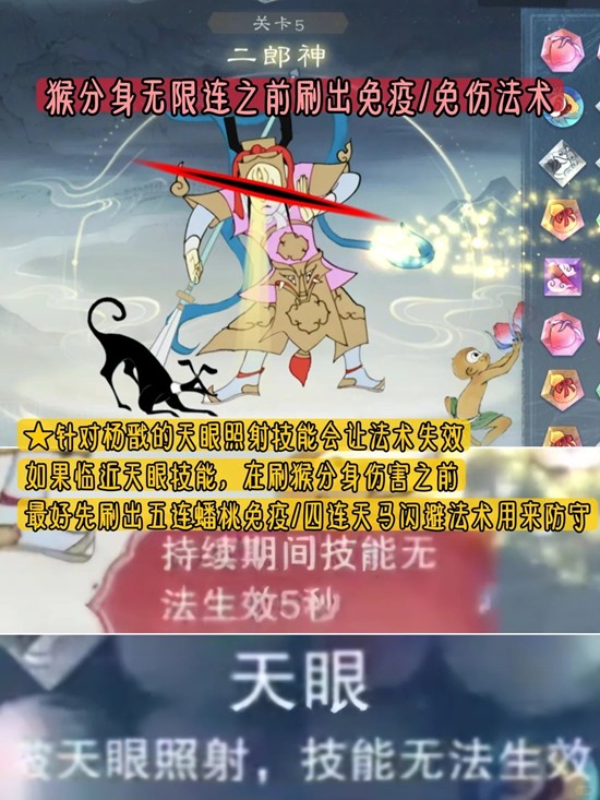 针对杨戬的天眼照射技能会让法术失效,如果临近天眼技能,在刷猴分身伤害之前最好先刷出五连蟠桃免疫/四连天马闪避法术用来防守