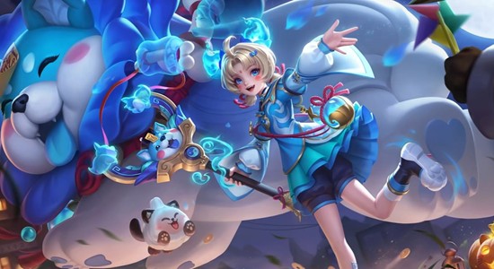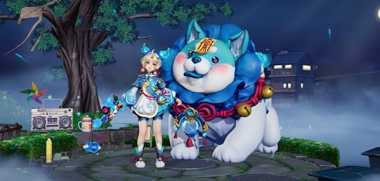 这款阿古朵·夜趣星史诗皮肤,以惊奇夜游园会为主题,将灵动的蓝白色作为主色调,巧妙地融入了彼岸红绳与金色铜铃等元素,营造出一种奇妙搞怪的灵异氛围,同时又不失鲜活可爱的国风韵味。阿古朵头顶浅金色短发,搭配红绳和跃动的灵火造型狗耳发饰,显得灵动俏皮。