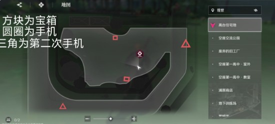 在高台住宅地,隐藏宝箱通常出现在建筑的角落位置。注意观察地面或墙边是否有代表宝箱的方块标记,同时留意带有手机图样的圆形印记。当前该区域的收集进度显示为0/2,说明需要找到两个目标物品。建议围绕住宅边缘缓慢移动视角,特别关注转角、楼梯下方以及阳台尽头这类容易被忽略的位置。这些地方在境界刀鸣的地图设计中常作为隐藏道具的藏匿点。