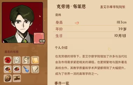 院长克劳德作为圣艾尔摩学院的领导者,其喜好偏向学术与自然。送花时选择红玫瑰可有效提升好感。在训猎环节,山羊是他偏爱的动物类型。饮食类礼物中,野梅烧肉可通过烹饪制作,而炼药获得的海德斯之境也是不错的选择。除此之外,他对于研究类物品尤为青睐,例如岩浆巨树的画作以及记录特殊事件的巨树事件笔记,这些都能大幅增加与他的亲密度。