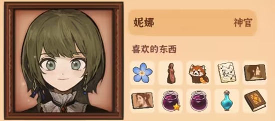 神官妮娜性格温柔,在剧情中占据重要地位。她同样喜欢勿忘我花束与小熊猫动物礼物。与莫娜相似,她也会对莫娜肖像产生积极反应。饮食类推荐葡萄果酱,该菜肴材料常见、制作便捷。炼药所得的吐真剂也是她所喜爱的物品之一。若想通过书籍增进关系,占卜的起源是最佳选择,这类故事书能快速推动好感进度。