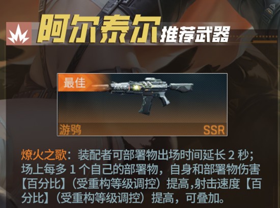 镭明闪击阿尔泰尔的输出机制高度依赖部署物的存续与数量,因此在武器选择上推荐使用游鸮。这把武器的核心被动可以延长部署物两秒出场时间,对于依赖部署打伤害的流派而言至关重要。每多一个部署物,阿尔泰尔及其所有部署的伤害都会按百分比提升,且效果可叠加。随着重构等级提高,加成幅度更加显著,无论是部署流还是侧击流都能完美契合这一机制。