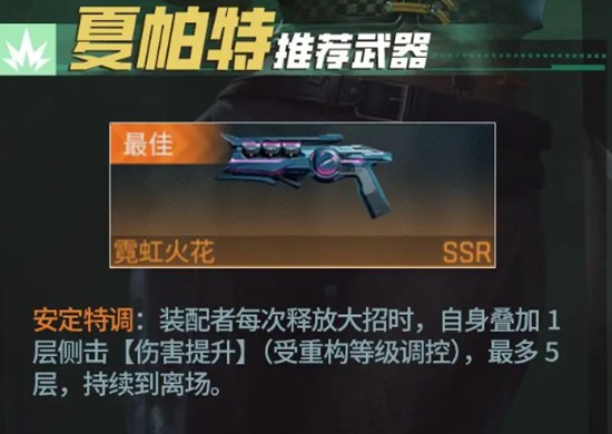 镭明闪击夏帕特的核心输出手段之一是侧击伤害,因此武器的选择至关重要。最适合夏帕特的武器是霓虹火花,该武器在释放大招后可为侧击附加增伤效果,最多叠加5层,并且增益效果可持续到角色离场。这意味着只要夏帕特持续在场,就能保持高额侧击输出。无论是走大招流还是侧击流路线,霓虹火花都能显著提升整体输出能力。随着角色养成进度的推进,叠加满层后的伤害飞跃尤为明显,后期表现尤为强势。