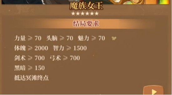 在火山的女儿中,魔族女王结局属于二周目及之后才能触发的隐藏结局之一,无法在一周目直接达成。该结局具有强烈的剧情反转色彩,是游戏中黑暗路线的重要代表。想要走向这条结局,首先必须确保女儿的各项基础属性达标。头脑值和魅力值均需达到70以上,这是开启多线剧情的基础门槛之一。体魄值则要求更高,必须累积至2000或以上,这通常需要长期参与高强度训练与战斗任务才能实现。
