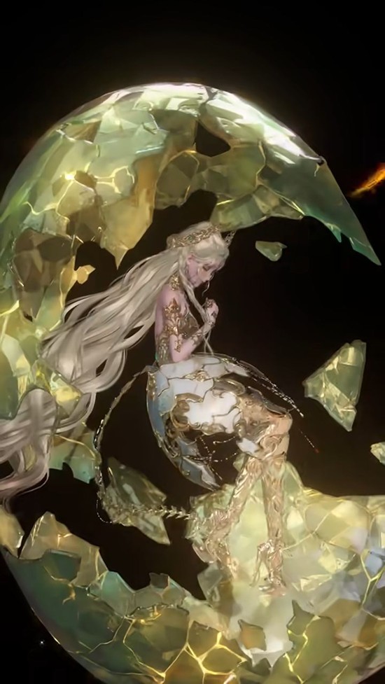 公主形态建模:轻盈柔软的纱质裙摆上流过蜿蜒的纹路,高雅又坚毅的公主形象跃然而生。水晶与银为主要材质的建模,尽显神圣与永恒之美。