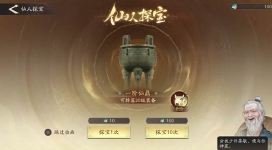 除了新增10个关卡外,还加入了仙人探宝这一全新系统。玩家通过通关主线和支线关卡可以获得食之精道具,使用这些道具在仙人探宝中就能抽取装备。初期就能稳定获得20级装备,随着群英会等级提升,还能解锁更高品质的装备。
