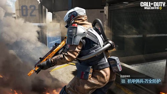 机甲佣兵-万全防护身穿一套厚重的高科技盔甲,整体设计以灰白棕为主色调,搭配红色的装饰条纹。盔甲的关节和背部采用模块化设计,兼具灵活性和实用性。