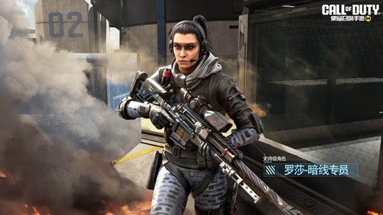 罗莎-暗线专员身着科技感十足的灰白色战斗服,肩部和胸部配有强化护甲,战斗服上印有醒目的LOGO,搭配战术靴和护膝,气质冷峻。
