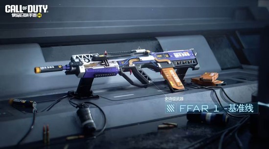 FFAR 1-基准线以紫色为主色调,枪托和弹匣处印有条形码。裸露的线路和散热管似乎证明武器内部有神秘电路。