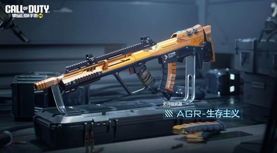 AGR-生存主义以橙色和黑色为主色调,扳机样式和握把防滑绑绳风格独特,弹匣印有醒目的“AGR-556”标识。
