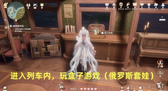 到列车内,找到特制版盒子游戏,点击进行游戏;(就是俄罗斯套娃游戏,猜一个橙色的套娃的位置)