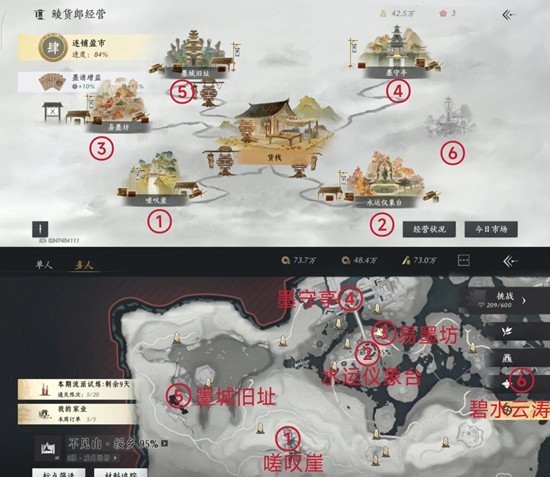 ⑤墨城旧址:传送君子坡界碑,大轻功飞到推荐建造点水池附近区域,个人推荐建造在上楼梯第二个平台的左侧或右侧;