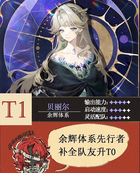 开篇省流:給限定角色排T1确实压力很大,但贝丽尔余辉队的表现比不上薪血、电能也是现实情况,我这里没有T0.5这种档位,于是就给T1了。毕竟【余辉队】作为一个只有两名成员的新晋体系,比不上四人满员的老体系也很正常。贝丽尔作为余辉体系的核心输出位,其地位会随着体系的补全而逐步抬升,厨贝丽尔的司辰倒也不必悲观。