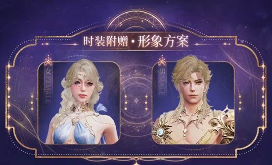 女性时装撷取银河碎屑点缀于长发,以月华为纱,潮汐为裙摆,当圣殿之门洞开星海,她携永夜的温柔降临,守护每一寸静谧。男性时装裹白昼光辉织成战铠,燃日冕为发,刻烈焰为图腾。黄金神扉映亮炽土时,他赋予万物磅礴光明,践行每一句承诺。
