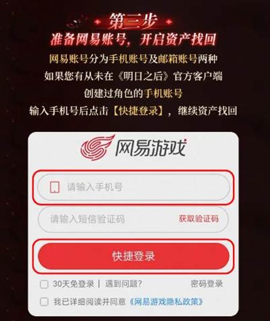1.网易账号分为手机号和邮箱账号两种。如果你之前是通过手机号创建的角色,输入手机号后点击“快捷登录”,继续资产找回。