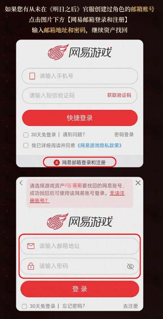 2.如果你之前是通过邮箱账号创建的角色,点击“网易邮箱登录和注册”,输入邮箱地址和密码,继续资产找回。