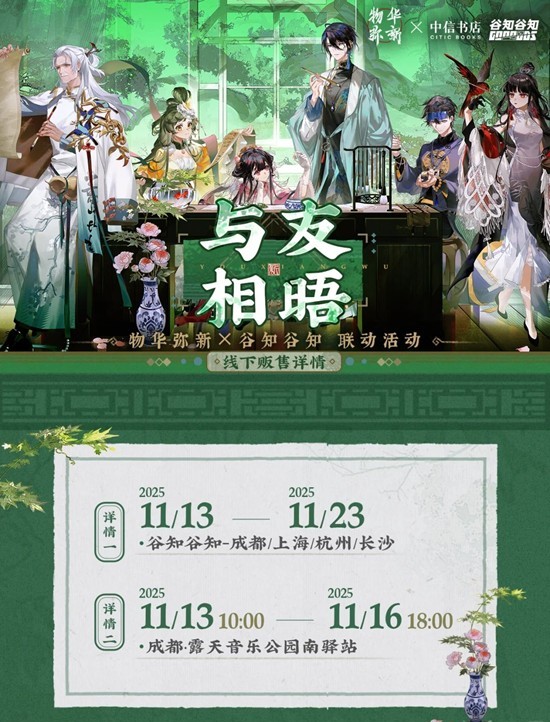 物华弥新联动活动:与友相晤四城线下快闪即将开启~物华弥新携手@谷知谷知GOOOODS ,开启四城线下快闪,期待与各位收藏家线下相逢!「与友相晤」系列周边将于11月13日正式线下开售,更有限定特典活动同步开展!一起来和小编看看吧~