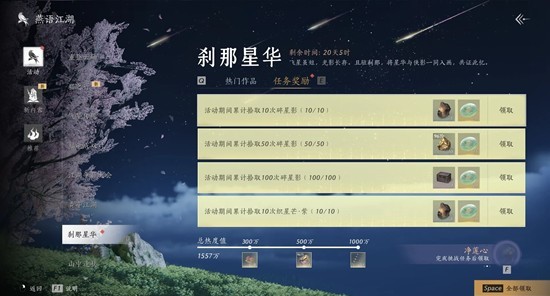 碎星影捡100个,后面三种各15个,可以打开刹那星华任务看进度