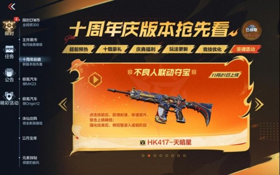 嘿,各位CFer!CFM十周年庆版本即将来袭,届时不良人联动夺宝活动也将同步开启!作为本次不良人套装的核心主武器,HK417-天暗星,不仅身披天罡三十六校尉天暗星的外观,更自带袁天罡三百年功力技能,快随我一起抢先看吧!