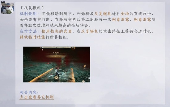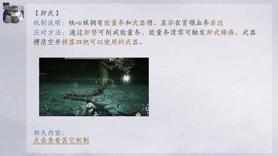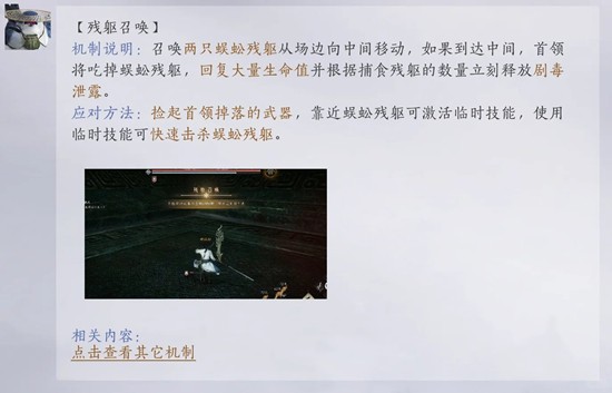 铁心蜈1-1:卸武机制后拿起武器,如分别在左前方标2号点位,右后方标3号点位。残躯召唤,BOSS会在2,3号点位刷新小蜈蚣,靠近利用武器击杀即可。需要注意的是,以电脑端为例,捡起刀后血条右方的出现的技能键不能点,扎不中的,你靠近怪后会出现一个新的黄色控制技能,这个技能才是百分之百扎中,1-2同理。目前会有卡刀丢刀的bug,处理方法看最下面。