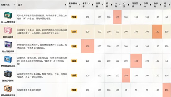 不同角色对礼物的偏好存在明显差异,例如绯莎对“鲷鱼烧模具套装”反应更积极,而拉薇则更青睐“枯山水茶道套装”。玩家可在誓约界面查看每位角色的喜好提示,以此为依据选择高效礼物。通用礼物如香氛浴盐球或鲷鱼烧模具套装虽可提升好感,但经验远低于生日专属礼品,仅适合非活动期使用。