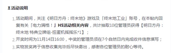 除了线上任务外,论坛互动也是明日方舟终末地电力满格的重要组成部分。玩家需在指定社区板块发布符合主题的回帖内容,即可参与抽奖资格评选。所有提交有效回帖的参与者都将获得游戏内头像奖励,同时还有机会被系统随机抽取为幸运管理员。本次活动共设置10位中奖名额,每位中奖者可获得扭蛋机摇摇乐一份及限量版周边礼品。此类实物奖励极具收藏价值,吸引了大量明日方舟终末地爱好者踊跃参与。