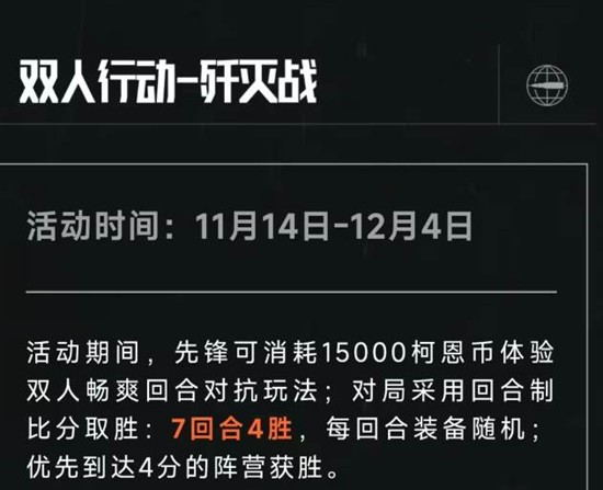 双人合作,并肩作战!双人行动歼灭战即将开启。活动期间,玩家可以消耗15000柯恩币体验双人畅爽回合对抗玩法。对局采用回合制比分取胜:7回合4胜,每回合装备随机;优先到达4分的阵营获胜。