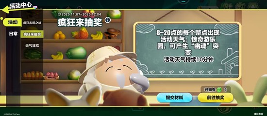 积分是参与蛋仔派对疯狂来抽奖的核心资源。玩家需要通过特定途径积累积分才能进行抽奖。主要获取方式来自全新天气“惊奇游乐园”。该天气每天仅在20:00至20:10之间出现,持续十分钟,必须准时进入农场等待刷新。一旦天气降临,农场内所有作物将触发幽魂突变,收获的变异果实可提交给田园阿公,每次提交即可获得相应抽奖积分。