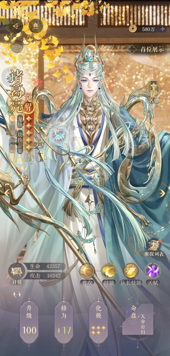 觉醒可以考虑不要利见,就是因为在诸葛兄弟队第四回合回溯消耗全部龙气后,可能第五回合结束会掉出龙脉,但四星天赋掉出龙脉后回2能量,第六回合橙星又回2能量,第六回合开始再开大进入龙脉并获得2能量,第八回合诸葛亮又可以开大记录状态(即使第八回合没有橙星也无所谓,等第九回合/第十回合橙星蹭上诸葛瑾的觉醒技,伤害还更高,前提是站得住)