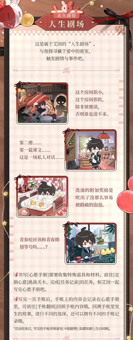 活动玩法:通过[主界面]-进入生日活动[烂漫新世代],与艾因一起回到钟灵屿,收集艾因过往的心愿,触发剧情与事件,将收集到的那些心愿与留言记录在[心愿手册]。