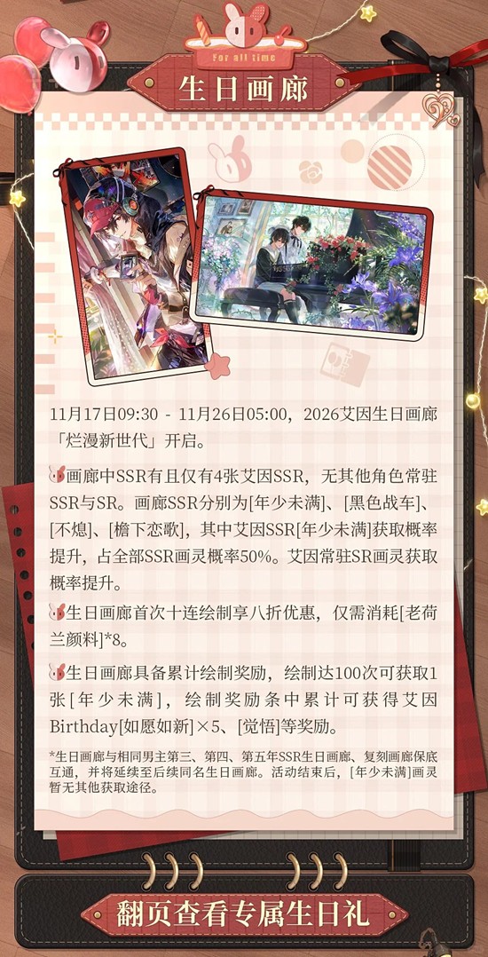 ► 11月17日09:30 - 11月26日05:00 ,2025艾因生日画廊「烂漫新世代」开启。画廊中SSR有且仅有艾因SSR[年少未满]、[黑色战车]、[不熄]、[檐下恋歌],无其他角色常驻SSR与SR。艾因SSR[年少未满]、艾因常驻SR画灵获取概率提升。