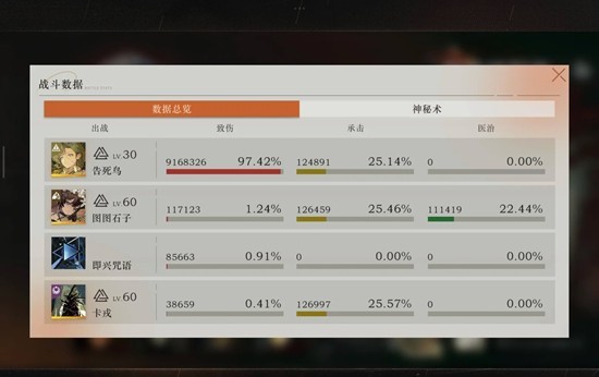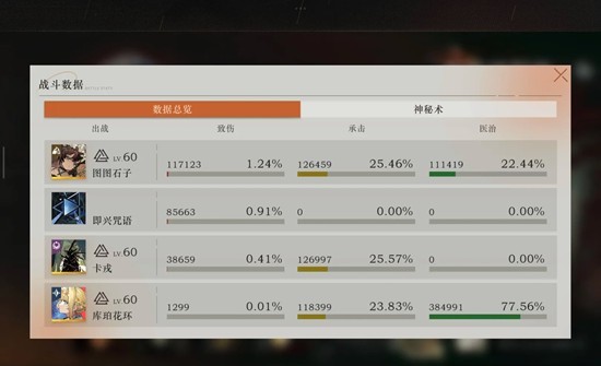 然后把组长换了卡戎。其实卡戎最后发不出伤害(不知道是关卡制约还是伤害太低干脆打不出来了,反正追击和减益都打不出来),但是并不影响告死鸟爆发伤害。加上奶+盾根本死不了,24回合直接打满。