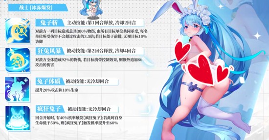兔子体质为菲尔提供了基础属性支撑,永久提升20%攻击力与10%最大生命值,使其兼具一定输出与生存能力,在绯月絮语的阵容体系中可胜任多类型角色需求。而另一个被动技能疯狂兔子则拥有40%基础概率在每回合开始时触发,当自身生命值低于50%时,触发几率提升至60%。成功触发后,菲尔将进入暴走状态,大幅提升后续行动效率,这一机制增强了她在残局中的反打潜力。