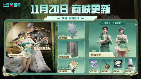 深秋已至,冬意渐浓,青绿山河染上金黄。在这个最诗意的时节,是时候换上最优雅的时装,踏上新的冒险旅程啦!《七日世界》全新典藏主题包【云羽沁珏】将于11月20日正式上架商城,带你领略千年美学精华,感受水墨画卷般的浪漫与优雅。