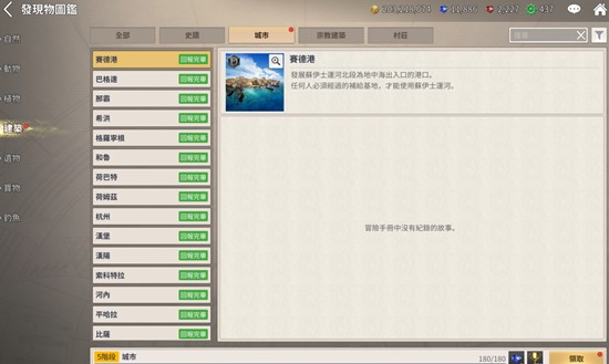 发现物图鉴是大航海时代起源中最基础也是最丰富的图鉴类型,涵盖自然景观、人文遗迹、动植物、建筑、宝物和鱼类等类别。当玩家航行至特定海域或抵达新城市时,部分图鉴会随着任务完成或航线经过自动解锁。更多稀有发现物则需要主动探索陆地与岛屿,靠近目标地点后触发发现事件,成功记录后即可收入图鉴。每一次靠岸停泊都可能带来新的发现,因此频繁探索未知区域是积累发现物图鉴的关键。