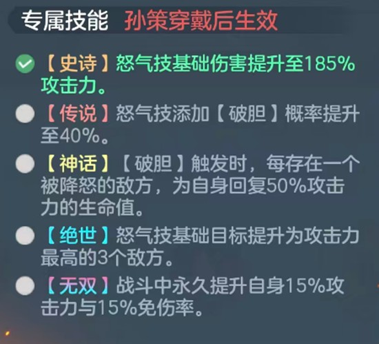 孙策的怒气技能可对前排敌人造成155%的伤害,并对已附带灼烧状态的目标额外提升15%伤害。同时有20%概率触发“破胆”,降低目标怒气值,从而延缓敌方关键技能释放节奏。这一机制在对抗依赖怒气的大招型武将时尤为有效。其天赋技能虎魂在达到传说一星时激活,每当己方或敌方有武将阵亡时,孙策可恢复2点怒气。这使得他在战局进入中后期后更容易频繁释放怒气技能,形成输出循环。传说二星与三星阶段则分别提供10%生命与防御加成,进一步提升其战场适应性。