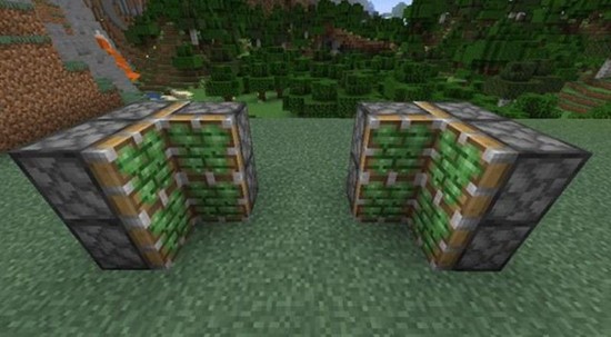 在门拱上方放置4个红石中继器,用红石粉连接并安装拉杆。使用时通过拉杆控制门的开合,关闭时门体与墙壁融为一体,很难被发现。
