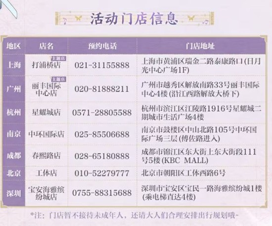 广州丽丰国际中心店(主题店)、上海打浦桥店(主题店)、深圳宝安海雅缤纷城店、北京工体店、成都春熙路店、南京中环国际店、杭州星耀城店。