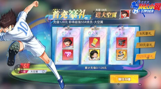 首充福利分为三个档位,分别为6元、30元和128元。6元档赠送首充礼包、彩钻和新秀召集券,属于入门级回馈。30元档额外增加头像框和超凡护具,提升角色外观与战力。而128元档则直接赠送SSR球员大空翼,这位前腰位置的核心人物在队长小翼王牌对决中具有极高的战术价值。同时该档位还包含“空域小将”头像和超凡护踝手套等稀有道具,整体回报非常可观。