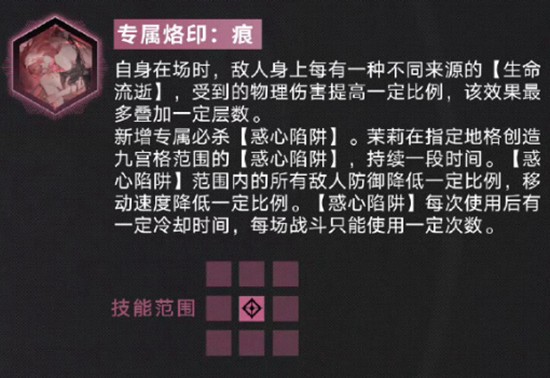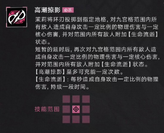 茉莉的必杀技“高潮掠影”可对指定九宫格区域投掷环刃,造成范围伤害并附加生命流逝状态。该状态会在短暂延迟后触发一次持续性伤害(DoT),对范围内所有敌人生效。配合专属烙印“痕”时,只要茉莉在场,敌方单位将始终处于多层生命流逝影响下,进一步提升全队物理伤害收益,增强整体输出效率。